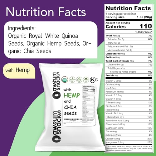 · Awsumsnacks Supercereal Chia & Hemp: A nutritious quinoa cereal created from Royal quinoa seeds, chia seeds, and hemp seeds in pleasant puffed star shapes, good for breakfast